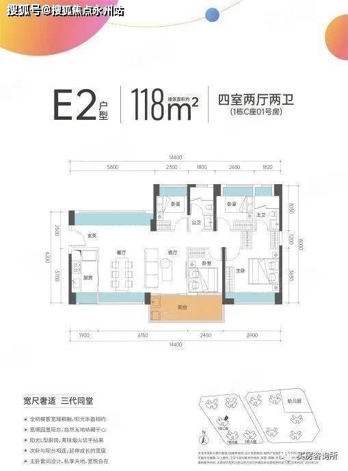 约89㎡南向3房,相比于市面上同功能3房,面积更小;约118㎡阔绰4房,带6.6米阳台,满足进阶生活更高享受。