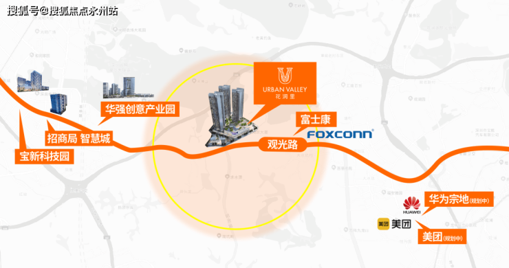 观光路沿途布局华强创意产业园、华润苹果小镇及富士康、华为、美团等具有世界级影响力企业,形成了堪称“第二深南大道”的北部产业生命走廊。