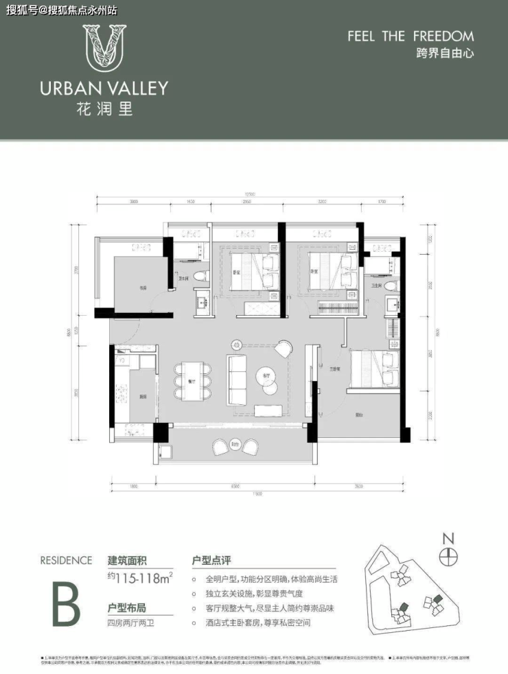 约115-118㎡的产品分别每个楼栋都有一条腿,设计独立玄关,功能分区明确,客厅大气,尺度疏阔。