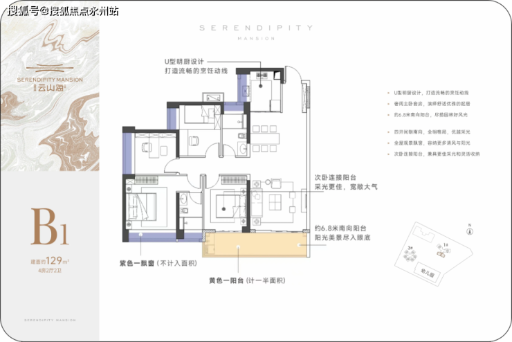 1栋单元住宅,2梯4户、2种户型,预计发售174㎡5房3卫户型,68套;129㎡4房2卫户型,64套;