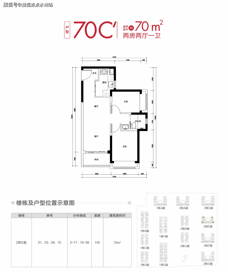 空间优化:与70B户型结构相似,但厨房采用U型设计,操作空间更充裕,卫生间增加收纳柜。