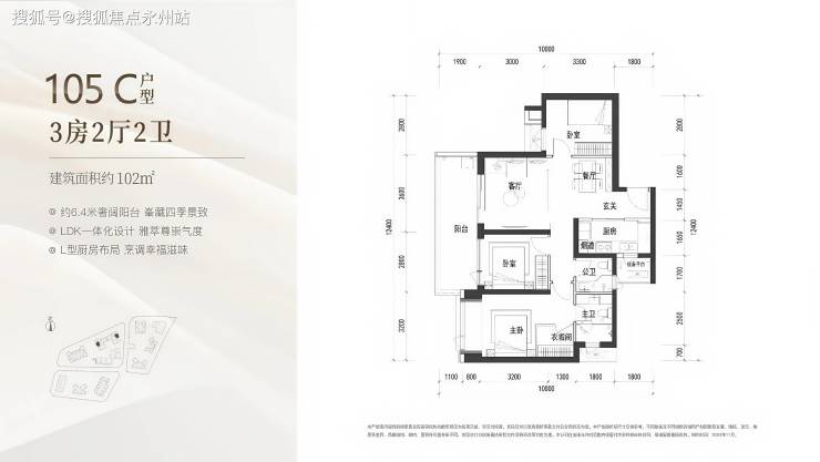 102㎡的3房2厅2卫,C户型(1栋1/2单元02户型),设计的是竖厅格局,客厅3.6米开间,LDK一体化设计,3个卧室分别做到了主卧16.93㎡/次卧9.24㎡/次卧8.96㎡(包含墙体飘窗),客厅连接次卧出6.4米长的宽景大阳台,U型厨房,卫生间干湿分离,得房率约90%(包含赠送),西南或东北朝向。(深圳南山翰熙典居售楼处电话:400-992-0669)