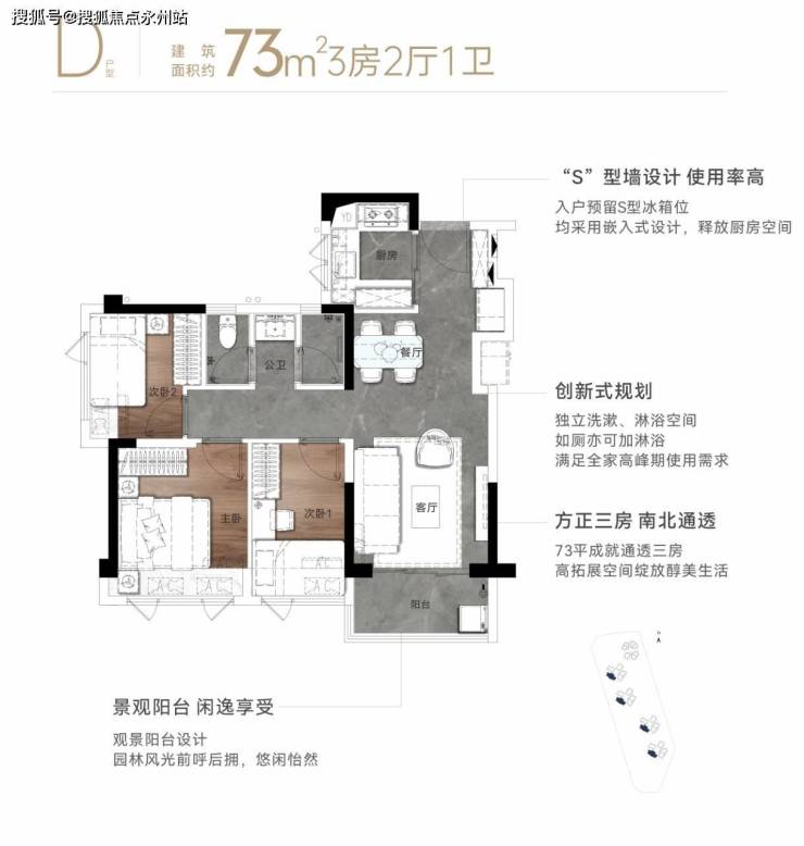 项目73平3房1.5卫的户型,放在全市也是非常少有的。兼具了质感、性能、美学三方面,满足三代同堂需求。