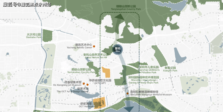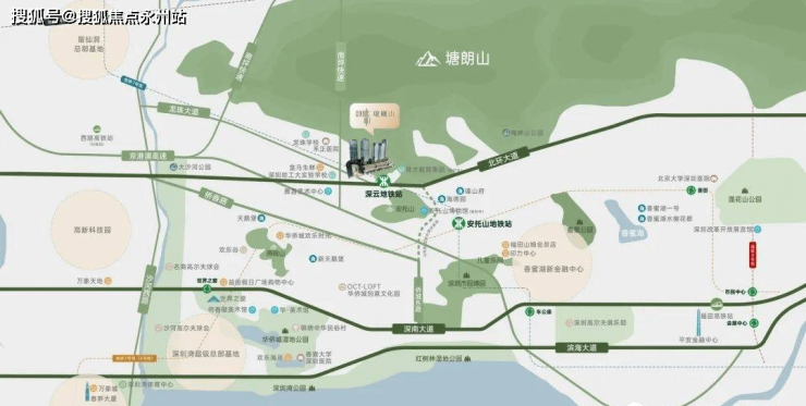 中心区域:深圳山海城中轴,左手香蜜湖、右手华侨城,六大总部基地环伺