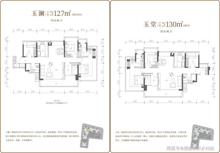 127-130㎡四房两厅两卫均为竖厅南北通透格局,进门设独立玄关,客厅5.1米开间,客餐厅分离设计。主卧带270°转角飘窗及衣帽间,127㎡户型主卧18.55㎡,130㎡户型主卧23.66㎡,其余次卧面积一致(11.2㎡、8.96㎡、7.84㎡)。U型厨房烟道外置,卫生间干湿分离,配备14.09㎡超大阳台,127㎡朝向为西南或东南,130㎡为东北朝向,得房率分别约98.97%、101.95%。