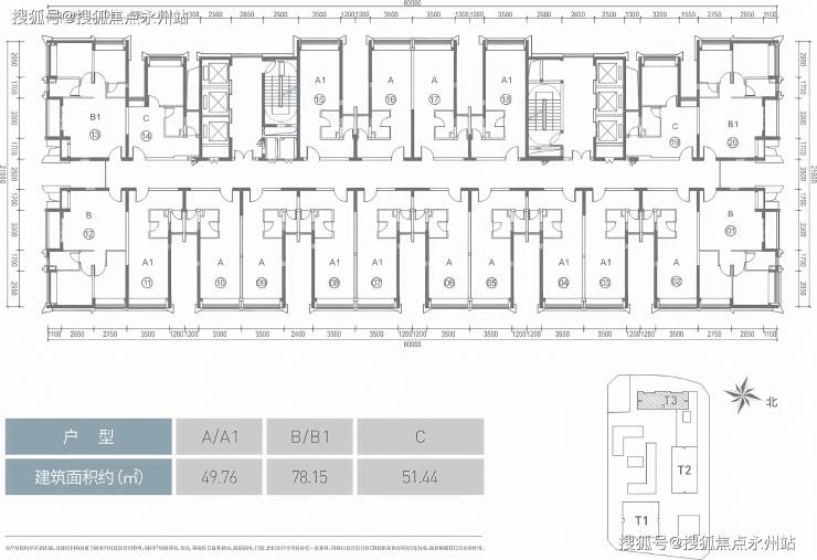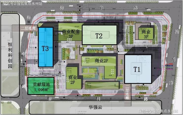 3栋主体:T1(41层)、T2(23层)为研发办公,T3(30层)为配套公寓,含2-3层商业配套。