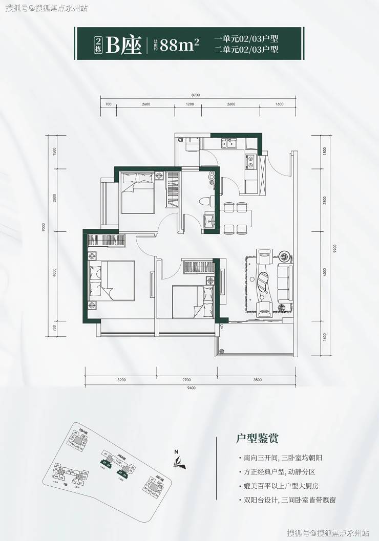2栋B座一单元02/03户型、二单元02/03户型:88㎡三房两厅一卫(西南朝向),共100套,占比约42.5%,为主力中间户型。