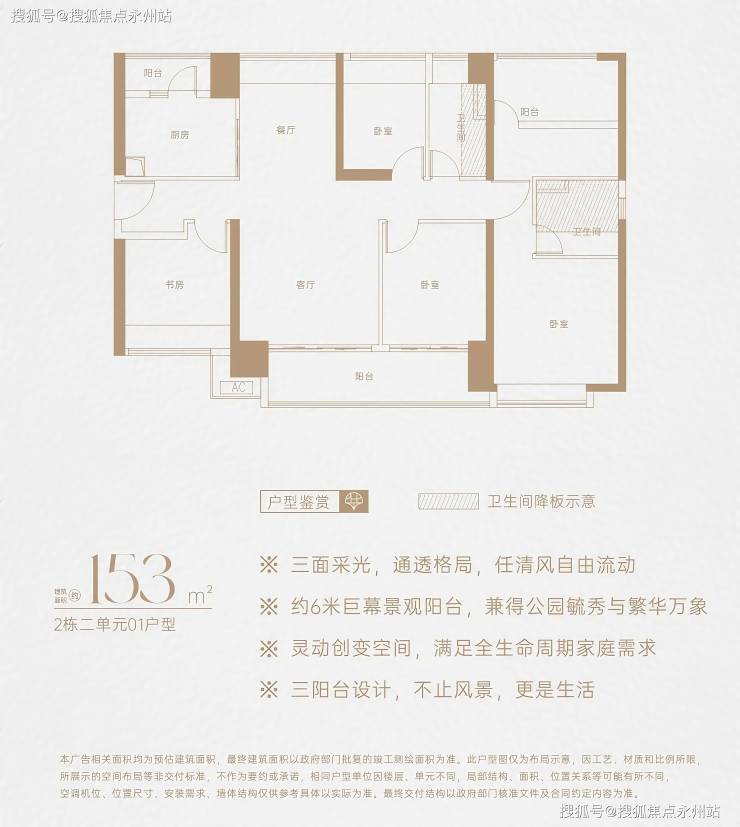 153㎡ 5房2厅2卫:竖厅南北通透,三面采光,6米景观阳台(连接客厅与次卧),U型厨房+生活阳台,得房率约73%(不含赠送)