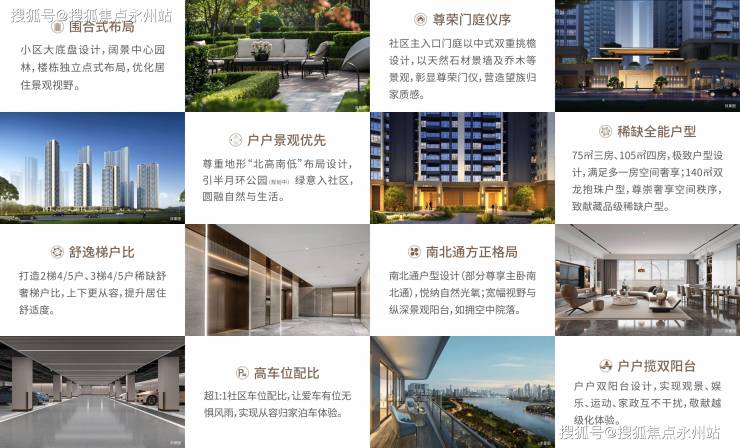项目产品设计:全户型方正,户户双阳台 + 多飘窗,部分户型实现南北通透,3梯4户/3梯5户配置,标准层高2.9米,车位比1:1.05。