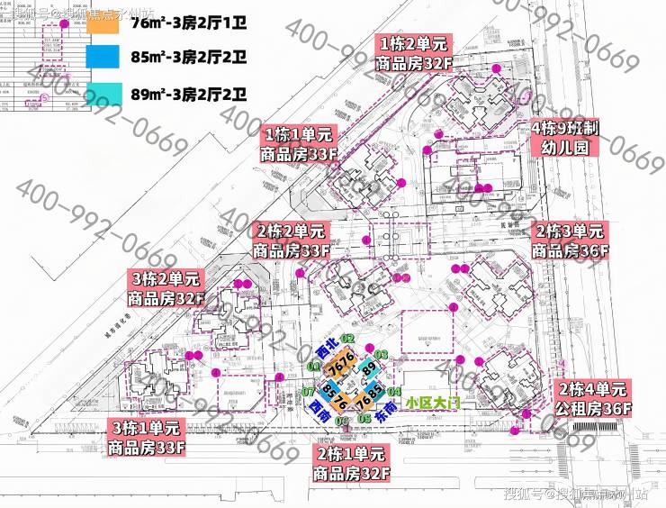推售面积有76㎡的3房1卫,85-89㎡的3房2卫户型。