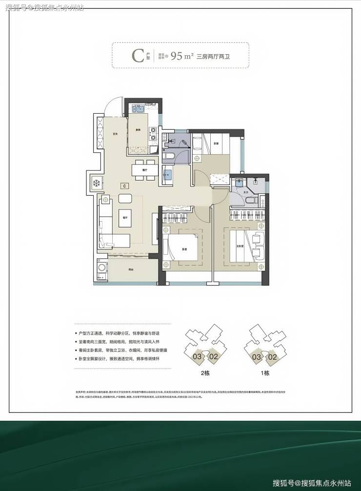 95㎡的3房2厅2卫(02.03户型),设计的是竖厅格局,进门独立玄关,客厅3.65米开间,S墙设计预留冰箱位,三开间朝南,3个卧室分别做到了3.1米/2.9米/2.6米的宽度,U型厨房,公卫三段式分离,得房率:80.07%(不含赠送),阳台朝西南或东南向。
