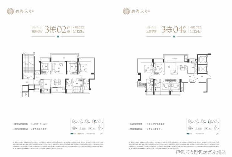 123-124㎡ 4房2卫:高端改善款。横厅南北通透格局,客餐厅出动辄数米的大阳台,将景观视野最大化。折后总价约852万-1023万