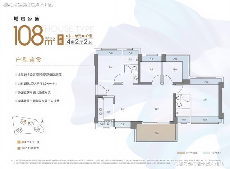108㎡的4房2厅2卫,设计的是横厅南北通透格局,进门独立玄关,客餐厅6.4米开间,LDKB一体化,五开间朝南,主卧双飘窗通透设计,全屋10个凸窗,4个卧室分别做到了主卧17.01㎡/次卧9.7㎡/次卧8.4㎡/次卧7.35㎡(包含墙体飘窗),L型厨房,卫生间干湿分离,得房率约91.88%(包含赠送),阳台主朝西南或东南向。