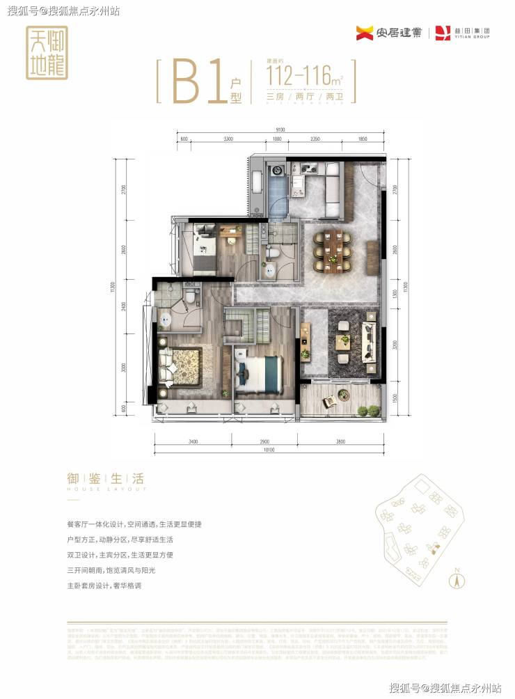 B栋56层4梯6户,01、03、04、06是116-119㎡三房;02和05是103-106㎡三房;