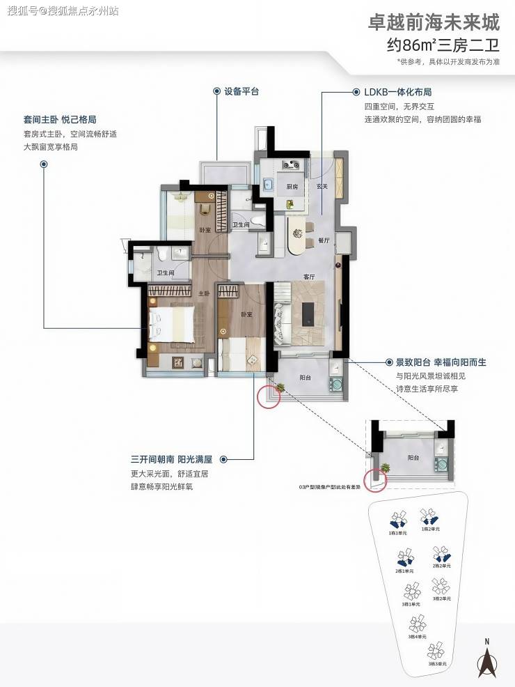 86㎡改善三房:三开间朝南,主卧套房设计(带独立卫浴),双阳台连通 LDKB 空间,部分房源可俯瞰海上田园景区。