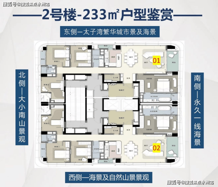 太子湾·鲸域,傲立湾海首排之巅,仅献尊贵70席,约233-307㎡的纯粹大户型海景公寓,尽揽南向一线海景的壮阔视野。其约3.6m的奢阔层高,打造无与伦比的居住空间;户户均配置三面景观阳台,将美景尽收眼底。此外,1:1.5的黄金车位比,确保每位业主的便捷出行;3梯2户的设计,更是让尊属体验更上一层楼,专梯入户,从容尽显。这样的稀缺顶阶豪宅配置,无疑是湾区塔尖人物生活尊崇格调的完美诠释。_营销中心_Vip Tel:400-992-0669 中介勿扰