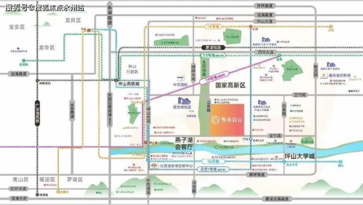 传承启元府位于坪山区金牛东路和兰景中路交汇处,项目规划总建面约55万平,除住宅外,还涵盖了商业、产业办公、教育资源等多重业态。