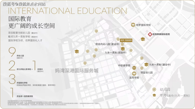 教育方面,自带1所18班幼儿园,东南侧规划有1所九年制36班公办学校(待建),目前还没公布,大概率也是南二外集团校区,会跟紫荆府同步交付;另外在东南侧距离700米处有一所南山第二外国语学校创新学校妈湾校区(在建,预计明年首届招生)