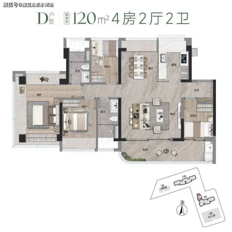 120㎡D户型只有一条腿,也是南北通透的设计。进门的第一个房有点小且不太好利用,做书房更为合适。客厅开间大,结合大阳台设计,整体也是三面采光。