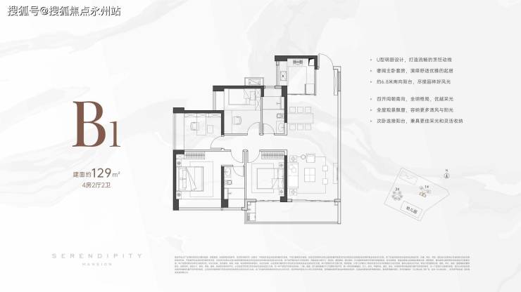 建面约116㎡四房二卫B3户型:竖厅设计,所有空间都比较平衡。小次卧采用了L型飘窗设计这一点比较惊喜,会有270度的视野。飘窗面积利用得不错,实际使用率超79%.