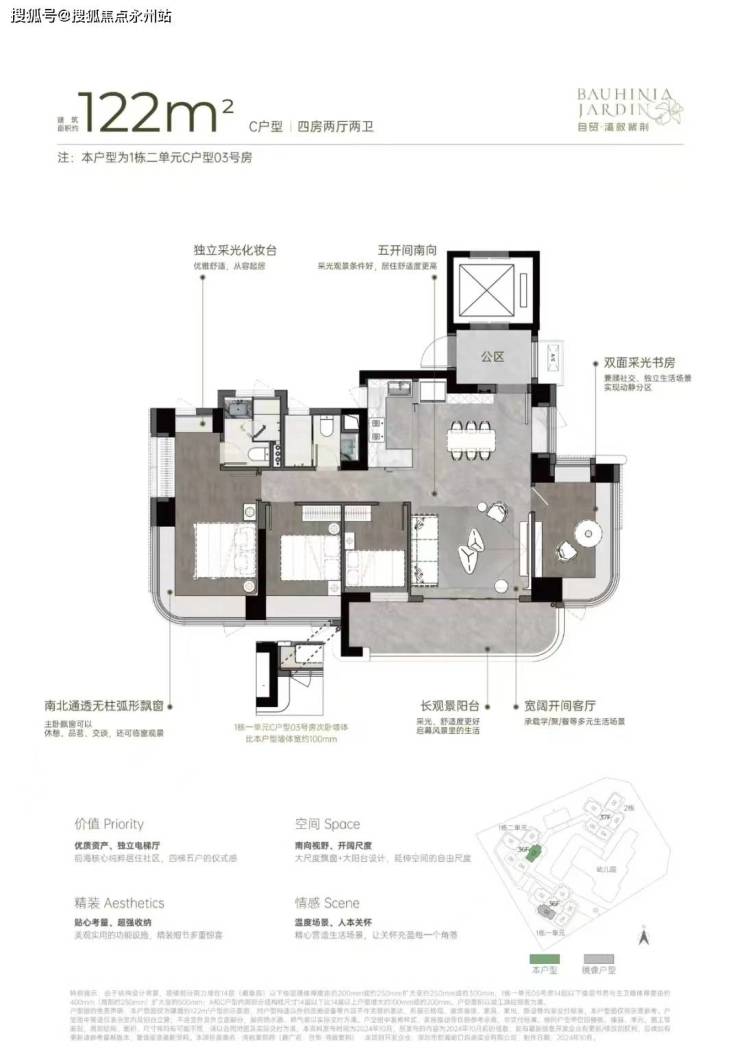 户型亮点:项目以四房为主,多种厅式可选,大面积的飘窗利用,采光面大、实用率高,转角处使用弧形玻璃且都是无柱设计,景观视野佳,四梯五户的配置加上独立电梯厅,提升了居住的便利性和私密性。