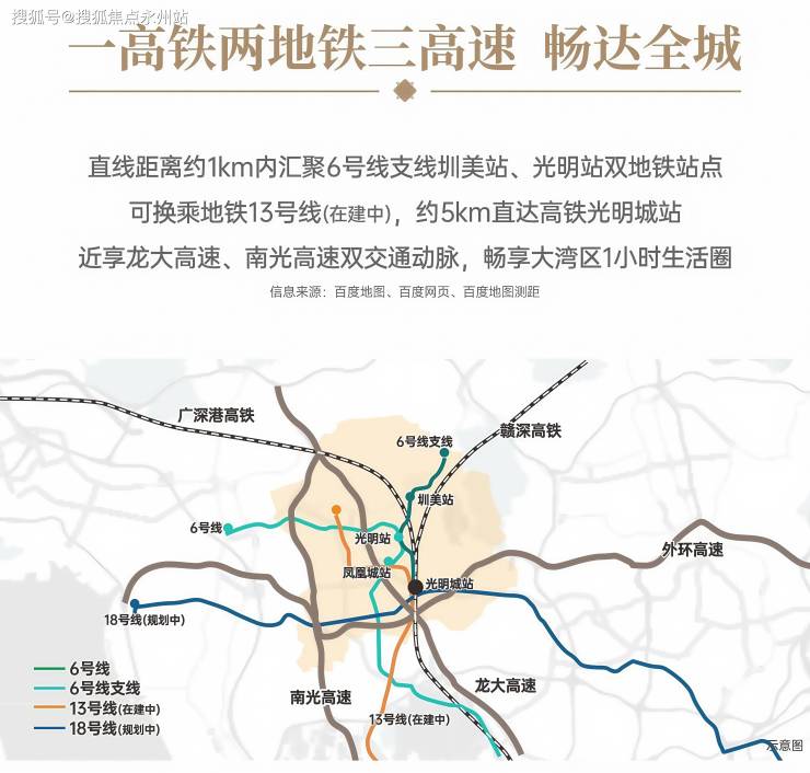 现有地铁:6号线支线圳美站(约900米)和6号线光明站(约1.2公里),可快速换乘13号线(预计2025年底通车),30分钟直达南山高新园、后海等核心商务区。