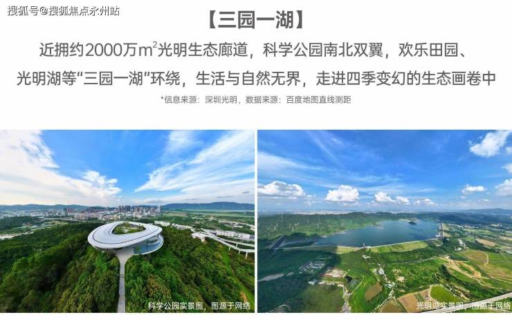 项目西北侧为科学公园北翼(已开放),东南侧毗邻光明欢乐田园,周边环绕约 2000万㎡光明生态廊道,形成“城在园中”的居住体验。