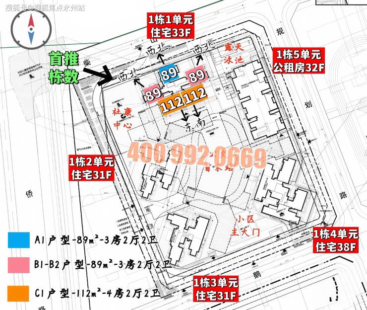 本次首推1栋1单元,共155套房源,面积有89m²的3房2卫,112m²的4房2卫户型,2梯5户设计,新规产品的。
