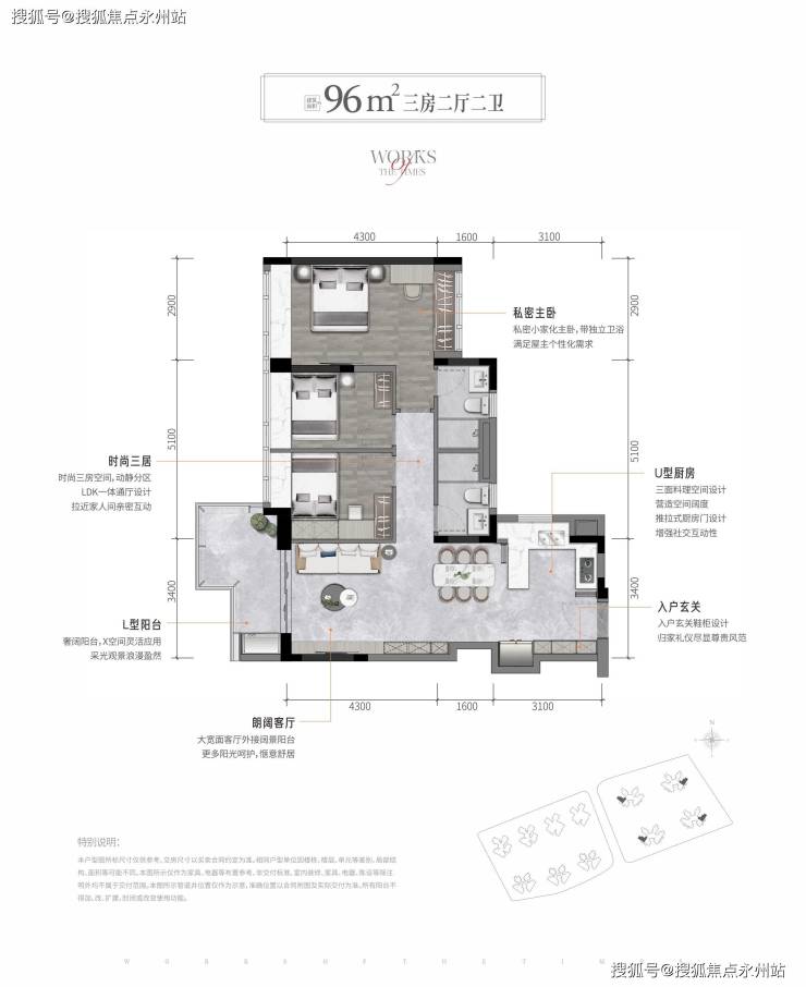 建筑面积约96㎡户型:东南、西南朝向,动静分区,餐客厅等宽一体化空间布局。大面积L型阳台,宽敞舒适功能全面。主卧自然通透双面开窗,满足个性化空间需求。双次卧配置均衡,功能全面。大面积U型厨房明亮舒适,入户预留配有收纳型玄关和冰箱位。