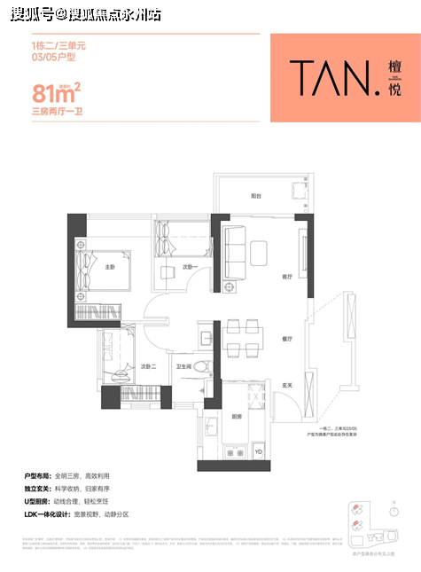 是本次推售的最小户型,三房两厅一卫,是全明设计,奶油风装修风格。整体的颜色偏浅、偏向柔和,以奶油一样轻盈温柔的颜色做整体的基调,给生活注入一抹温馨滤镜。全景通透三房沐光而上,尤其LDK餐客一体化,贯通各功能区,赋予空间更多互动意义。全屋飘窗设计,最大化提高使用率。