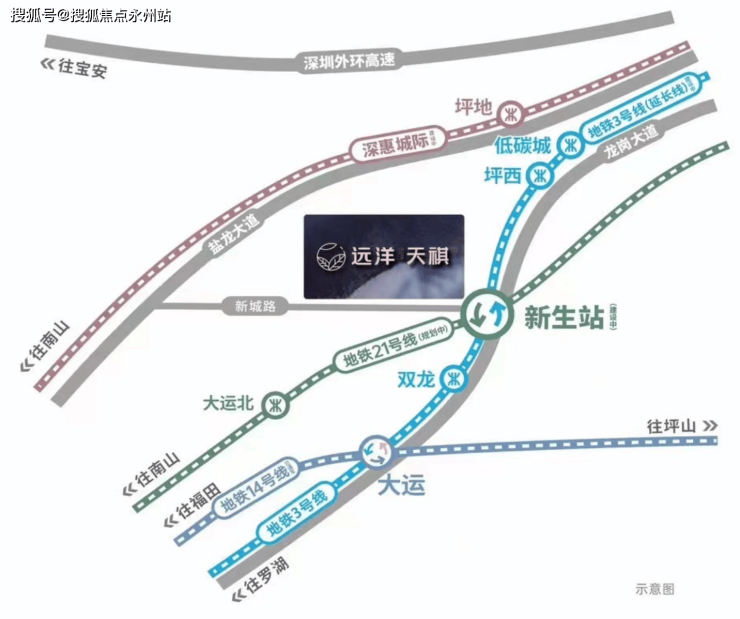 地铁3号线东延线通车在即:距离项目仅500米的新生站已进入主体施工阶段,预计 2025 年正式通车56。通车后,可15分钟直达大运枢纽,30分钟畅联福田CBD,彻底打破坪地“交通末梢” 的固有印象。此外,规划中的21 号快线(连接前海与坪地)和深惠城际(2026-2027 年通车)将进一步强化区域与深圳核心区及惠州的联动,形成 “地铁 + 城际” 的立体交通网络。