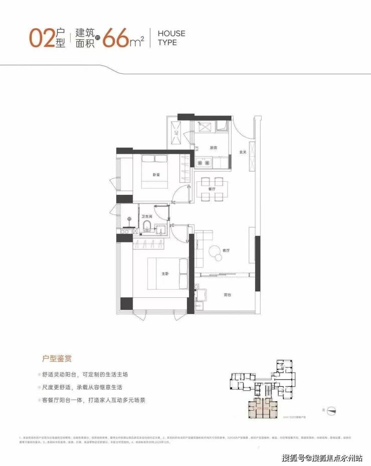 66㎡两房两厅一卫:竖厅格局,LDKB一体化设计,动静分区;主卧双飘窗,二字型厨房,卫生间干湿分离;西南朝向,赠送后得房率约93%,适配单身或小两口刚需。