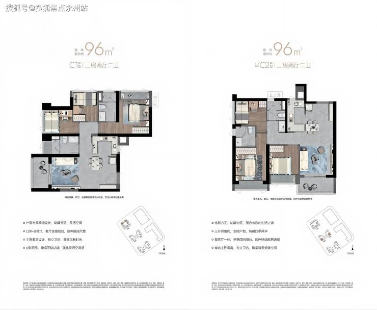96㎡三房两卫(C1/C2 户型):双卫设计,主卧套间带独立卫浴,东北 / 西南朝向,总价 500 万起,适合改善家庭。
