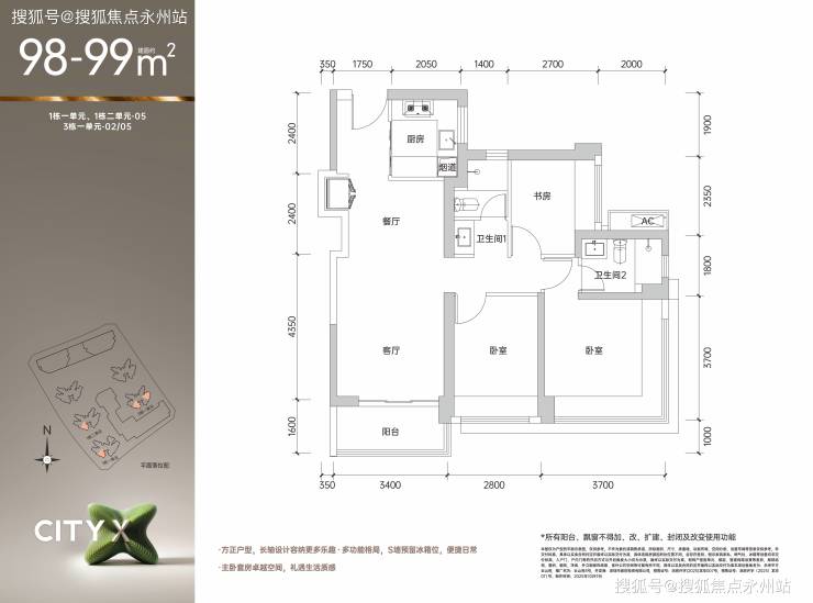 建面约98㎡三房二卫:舒适型刚需户型,三开间朝南设计,南向采光面近10米,采光通风俱佳。玄关、客厅及厨房预留充足收纳空间,如S型冰箱位、整面电视墙收纳,兼顾实用性与空间感。