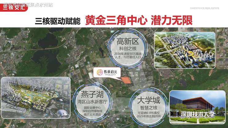 传承启元位于深圳坪山区高新区、大学城与燕子湖国际会客厅三核交汇的核心区域,是深圳东进战略的重要承载地。