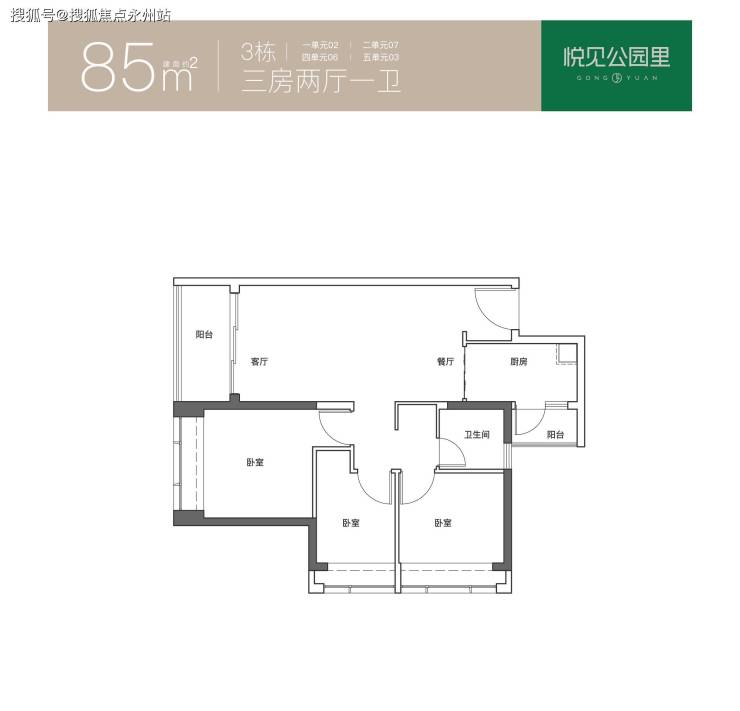 85㎡的3房2厅1卫,折后总价297-319万/套,单价3.49-3.75万/㎡