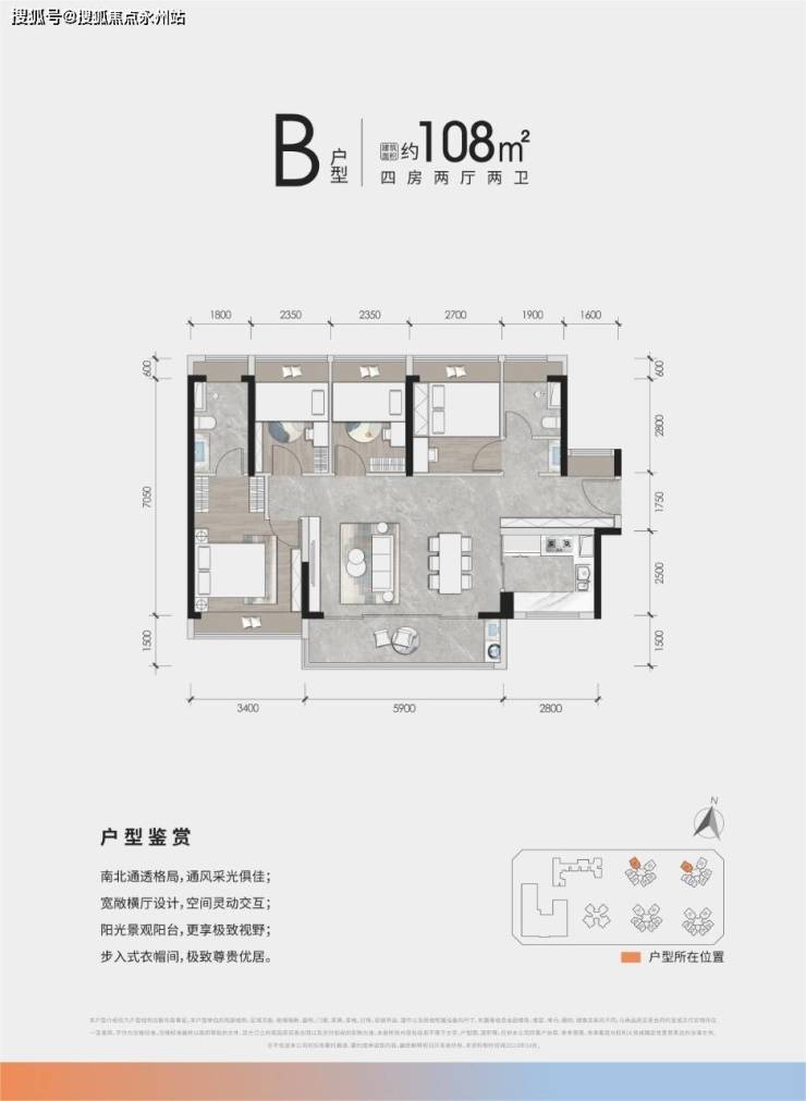 108㎡ 4房2厅2卫:稀缺南北通透4房,约5.9米阔绰阳台,三分离卫生间