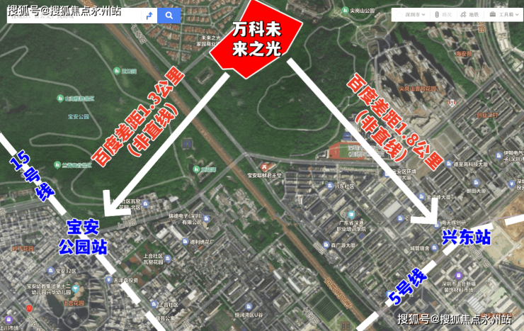 项目周边邻近京港澳高速、南光高速、南坪快速等交通主干道,当下距离最近的是5号地铁线“兴东站”约1.8公里,楼下后期有公交首末站接驳到地铁站约20分钟,规划在建的15号地铁线“宝安公园站”距离约1.3公里。