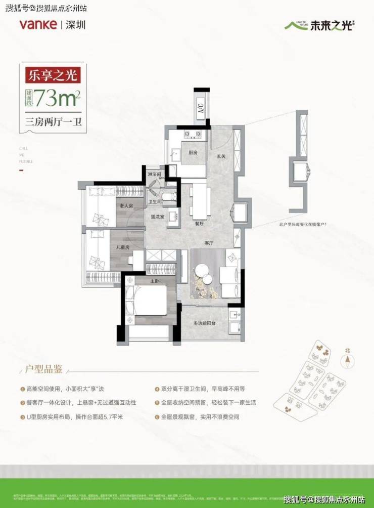 73㎡的3房2厅1卫,设计的是竖厅格局,进门入户玄关,LDKB一体化,S墙设计预留卡槽冰箱位,U型厨房,卫生间三段式分离,得房率79.63%(不含赠送),东北、西南或东南朝向。