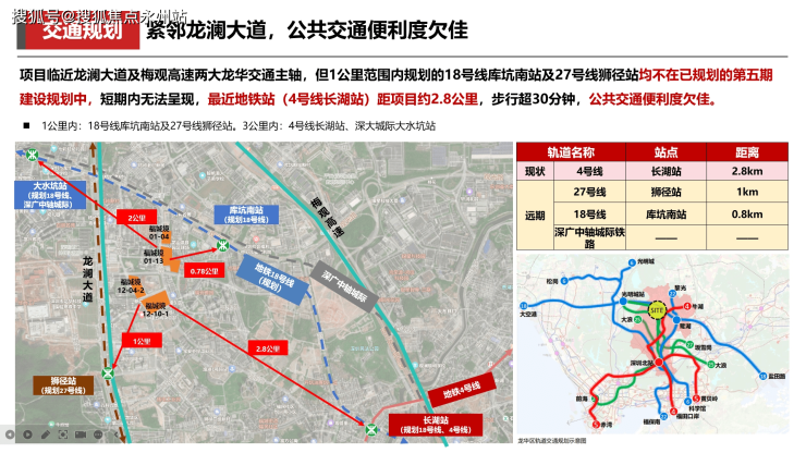 项目区域内主次干路体系完善,交通便捷。片区交通规划优异,规划打造“4线2路”的交通体系,1公里范围内拥享18号线库坑南站及27号线狮径站,临近梅观高速及龙澜大道两大龙华交通主轴,30分钟可达深圳北站及福田CBD核心区,不过当前最近的4号线“长湖站”距离约2.8公里,步行超30分钟以上。
