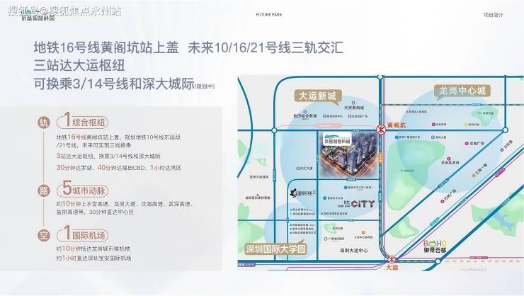 项目临近16号线黄阁坑站上盖(步行3分钟),未来10/21号线接入,3站到大运枢纽换乘3/14号线,40分钟直达福田CBD。