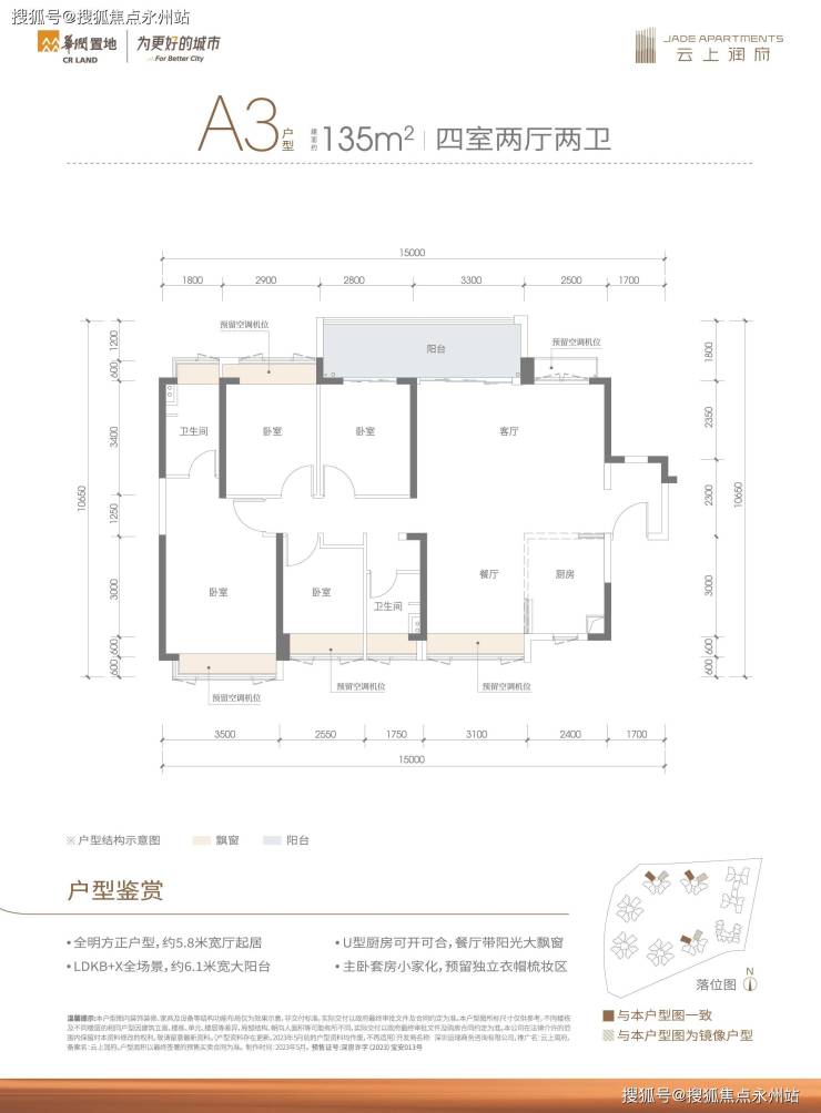 135㎡的4房2厅2卫,折后总价531-573万/套,单价3.92-4.23万/㎡。
