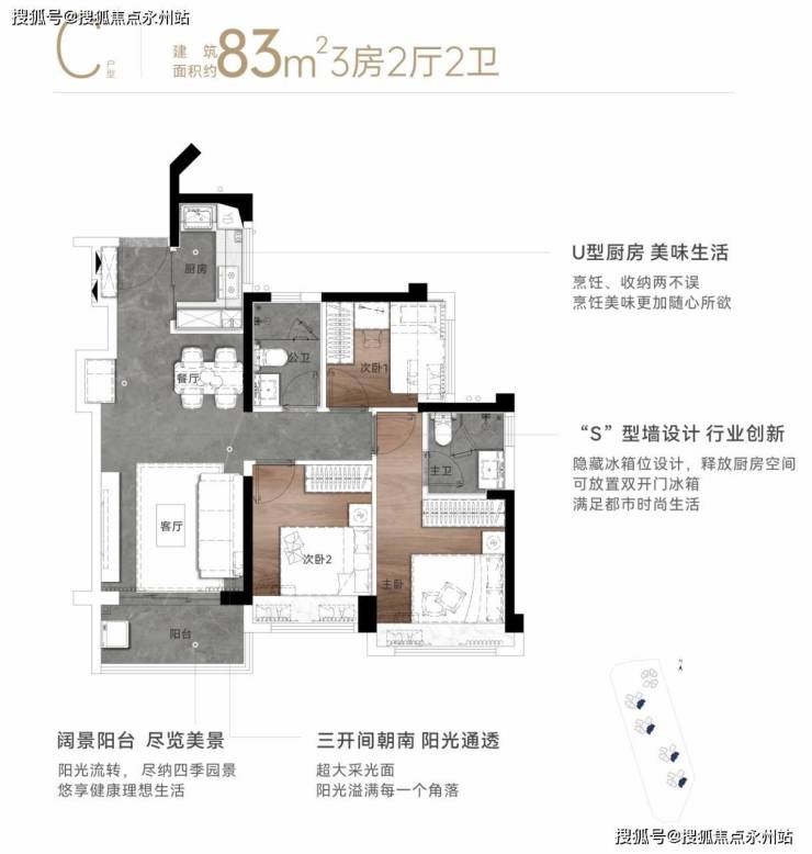 项目针对不同家庭需求,推出73-97㎡三至四房户型,均采用高得房率设计(80.3%-80.4%,不含飘窗),并通过创新布局实现空间高效利用。