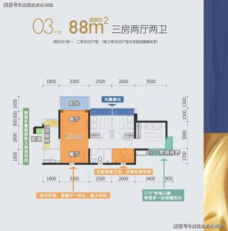 88㎡三房两厅两卫:竖厅格局,客厅3.3米开间,有西北及东北朝向,全明户型 纳阳光清风入怀,主卧套房设计 尽显尊贵从容