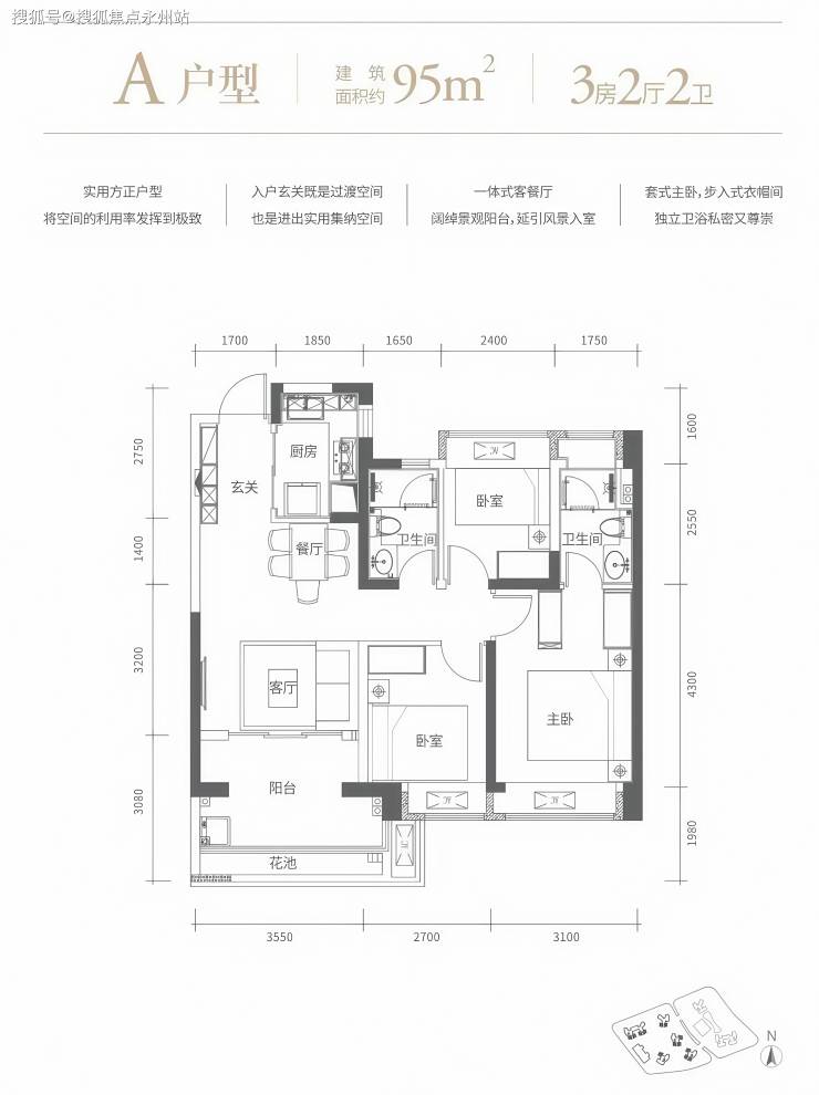 95㎡的3房2厅2卫,设计的是经典竖厅格局,客厅3.55米开间,进门玄关,LDKB一体化设计,动静分区,三开间朝南,3个卧室分别做到了主卧15.19㎡/次卧8.64㎡/次卧7.56㎡(包含墙体飘窗),L型厨房,卫生间干湿分离,得房率72.48%(不含赠送),有东南、西南或正南朝向。