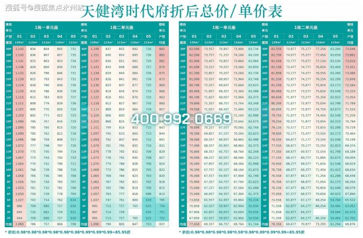 楼层分布:中低楼层(1-14层)折后总价 942-1050 万(单价6.77-7.55万/㎡),高楼层(15 层以上)海景房总价 1100-1199 万(单价7.91-8.63万/㎡),溢价率约 10%-15%。