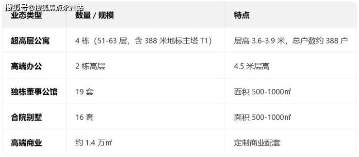 超高层公寓:4栋51-63层超高层,含388米地标主塔T1,总户数约300户,主打大平层产品,层高3.6-3.9米,远超普通豪宅标准。