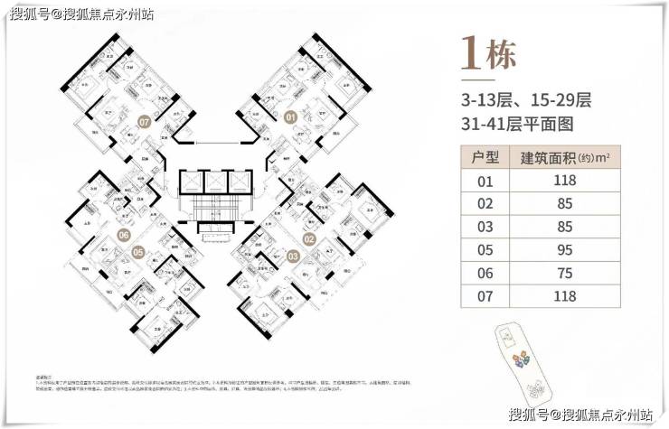项目梯户比为3梯6户,所有户型的朝向均为东南或西南,户型分布如下图: