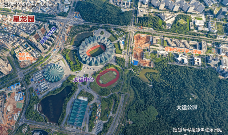 项目临近地铁16号线的大运中心站A2和B出口之间,星龙园北侧一路之隔是龙岗外国语学校、西侧是绿景大公馆,与大运中心体育场馆、大运中心仅一路之隔。项目占地面积约9866.58㎡,总建面约75085.93㎡,由3栋建筑组成,其中1、2栋为住宅楼,建设为42层的超高层楼体,3栋为配建的6班幼儿园。