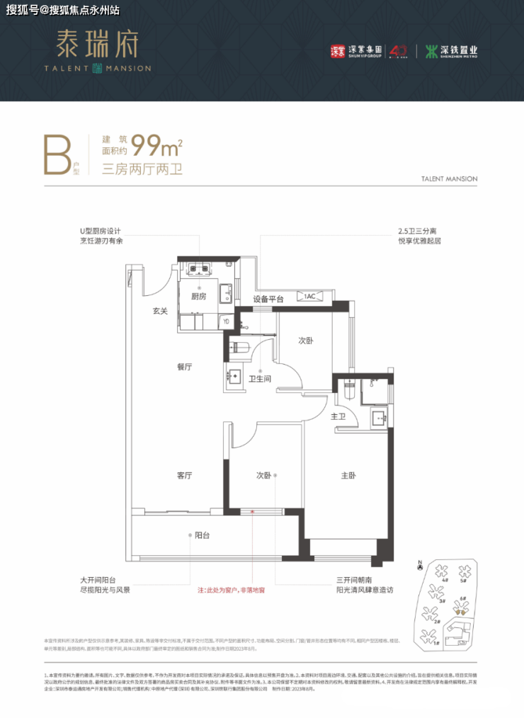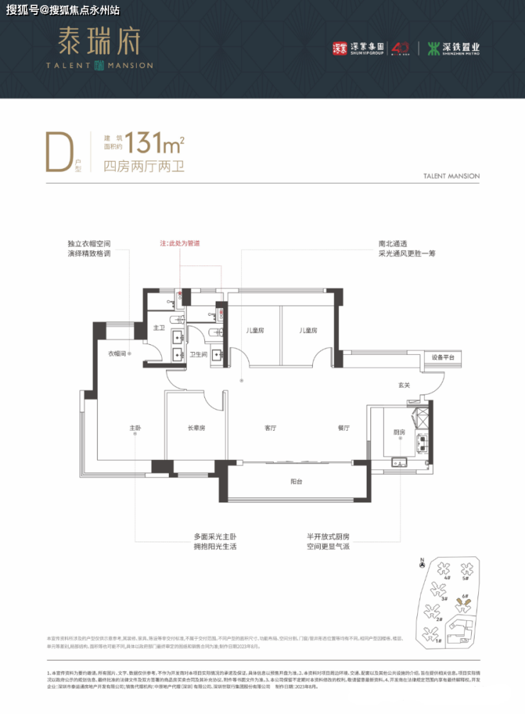 项目现加推1栋,总层高43层,三梯6户设计,1栋正好在主干道如意路与龙飞大道交叉路口,每层楼有3户约99㎡的三房两卫,1户约88㎡三房1.5卫设置,1户115㎡的四房两卫及1户143㎡的五房两卫的设计。